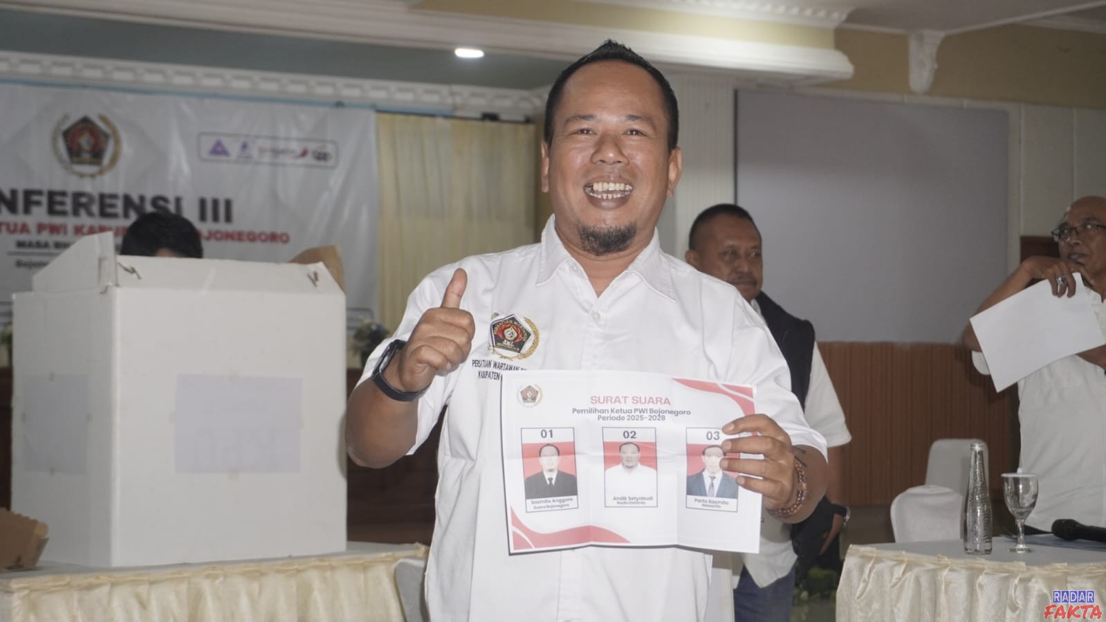 Ketua Panitia, Nurkozim, dalam laporannya menyebutkan bahwa sebanyak 20 anggota menggunakan hak pilihnya, terdiri dari 11 anggota biasa dan 9 anggota muda. Dari proses penjaringan, muncul tiga nama bakal calon ketua, yakni Sasmito Anggoro (SuaraBojonegoro.com), Andik Setyobudi (Radio Elshinta), dan Parto Sasmito (Nawacita.co).