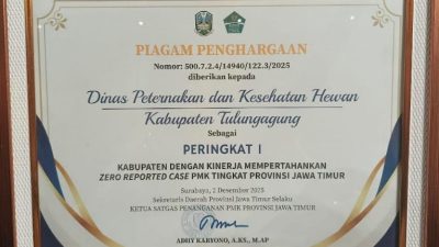 TULUNGAGUNG ,Radarfakta – Dinas Peternakan dan Kesehatan Hewan (Disnakkeswan) Kabupaten Tulungagung menutup tahun 2025 dengan gemilang setelah berhasil memborong total enam penghargaan bergengsi dari Pemerintah Provinsi Jawa Timur. Keberhasilan ini menjadi penanda kuat komitmen daerah dalam meningkatkan kualitas pelayanan publik, memajukan sektor peternakan, serta kinerja luar biasa dalam penanganan dan pengendalian Penyakit Mulut dan Kuku (PMK).
