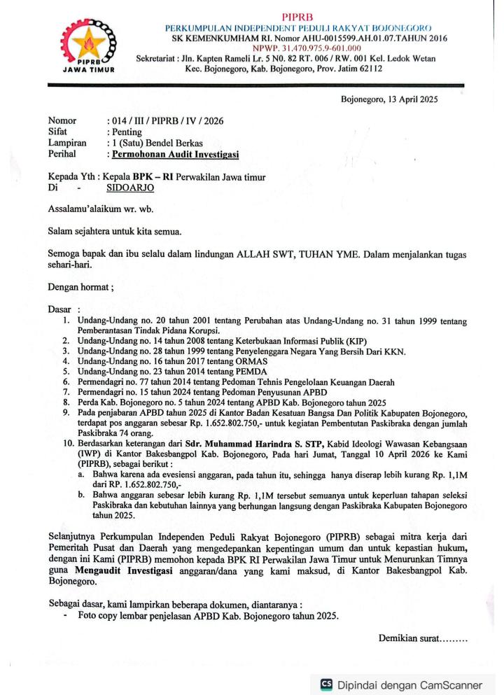 BOJONEGORO – RADARFAKTA.COM // Lembaga Swadaya Masyarakat Perkumpulan independen peduli rakyat Bojonegoro (LSM PIPRB) yang beralamat di jl kapten Ramli lorong V Ledok wetan kecamatan Bojonegoro akan melayangkan surat permohonan audit investigasi ke Badan Pemeriksa Keuangan (BPK) RI.
